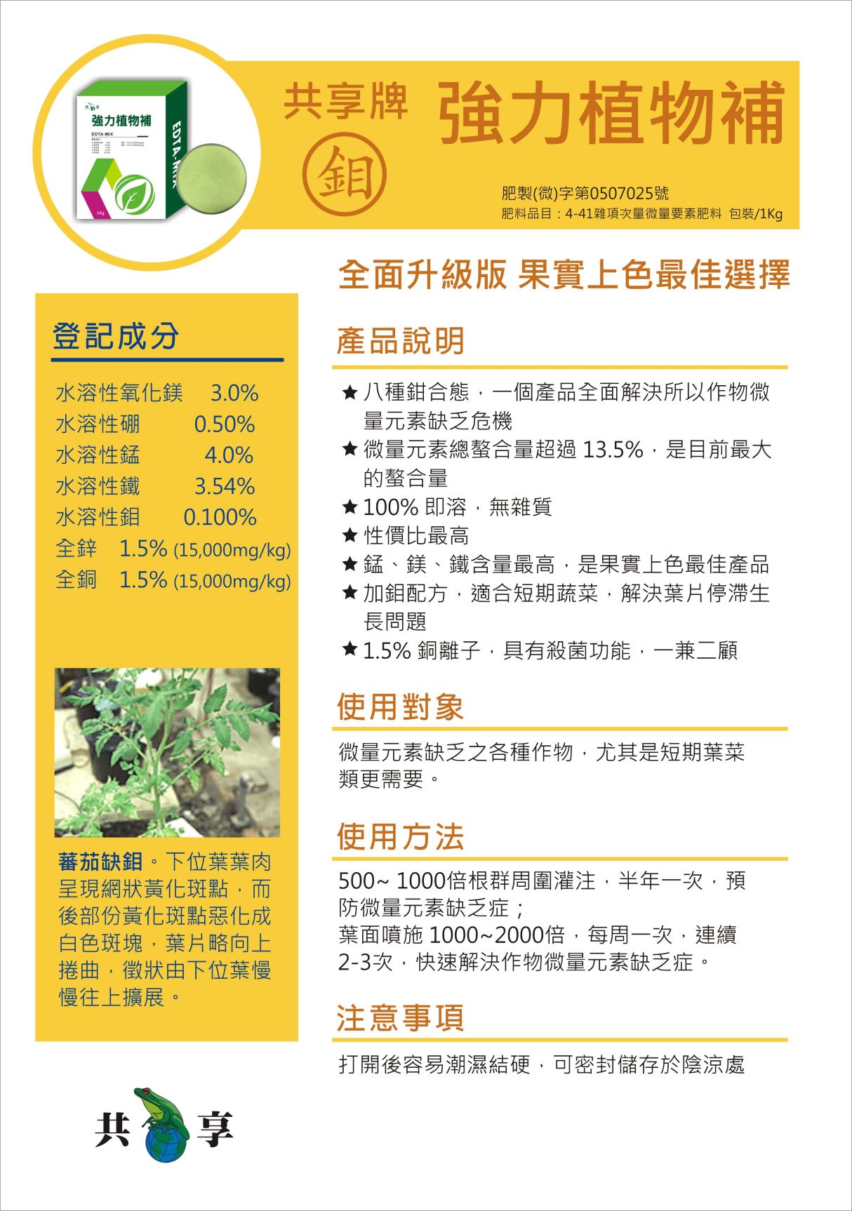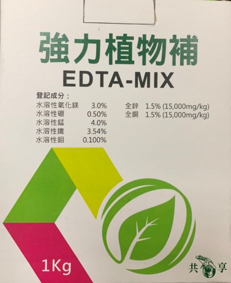 水溶性氧化鎂3.0 水溶性硼 0.50 水溶性錳4.00 全鋅 1.50 水溶性鉬0.1 水溶性鐵 3.54 全銅 1.50