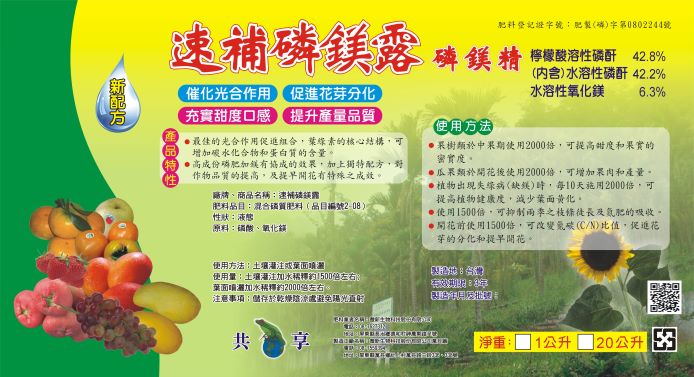 一種利用磷鎂協同作用提高光合作用能量的配方 檸檬酸溶性磷酐:50.0%(內含) 水溶性磷酐:40.0% 水溶性氧化鎂: 7.0%