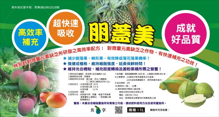 登記成分:水溶性氧化鈣 10 % 水溶性氧化鎂 3.5 % 水溶性硼 1.2 %